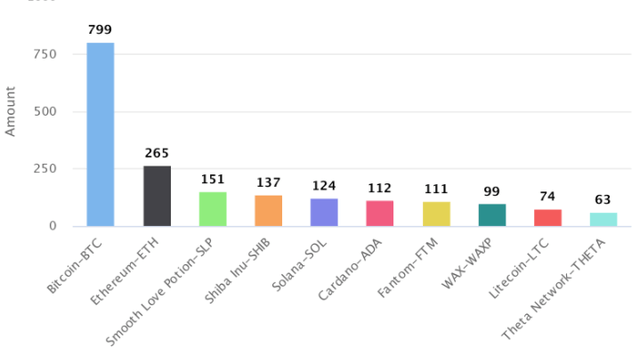 이어 이더리움(ETH, 265회), 스무스 러브 포션(SLP, 151회)가 2위, 3위를 차지했다.