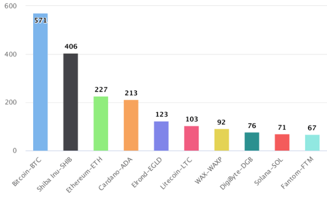 4위~10위에는 카르다노(ADA, 213회), 엘론드(EGLD, 123회), 라이트코인(LTC, 103회), 왁스(WAXP, 92회), 디지바이트(DGB, 76회), 솔라나(SOL, 71회), 팬텀(FTM, 67회) 등이 이름을 올렸다.