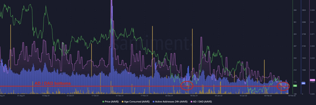 센티멘트는 "활성화된 예금(AD) 대 일일 활성주소(DAD)의 비율(AD/DAD)을 따져 바닥 지표를 확인할 수 있다"며 "통상적으로 비율값이 낮으면 좋은 매수 기회로 여겨진다"고 설명했다.