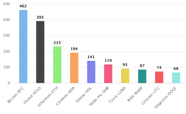 4위~10위에는 카르다노(ADA, 194회), 솔라나(SOL, 141회), 시바이누(SHIB, 119회), 테라(LUNA, 93회), 왁스(WAXP, 87회), 라이트코인(LTC, 74회), 디지바이트(DGB, 68회) 등이 이름을 올렸다.
