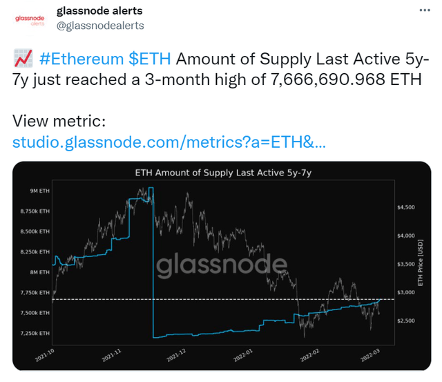 가상자산(암호화폐) 분석업체 글래스노드는 28일(현지시간) 트위터를 통해 "지난 5~7년 동안 움직이지 않은 이더리움(ETH)이 766만669.968ETH 규모로, 최근 3개월래 최대 수준을 기록했다"고 밝혔다. 이는 약 215억달러 상당이다.