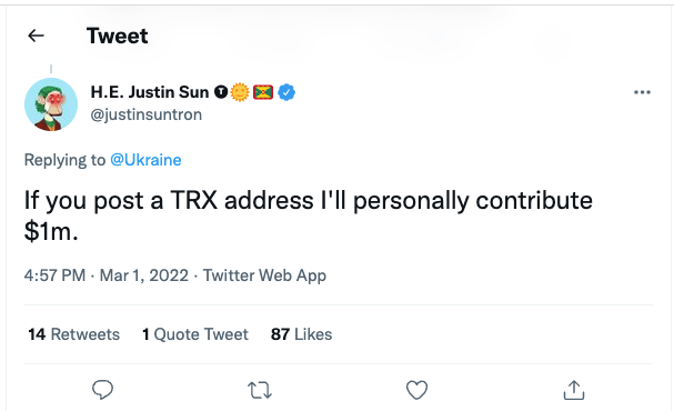 저스틴 선 트론(TRX) 창시자는 1일 자신의 트위터를 통해 "우크라이나가 TRX 기부 주소를 공개한다면 나는 TRX를 100만달러치 기부하겠다"고 밝혔다.