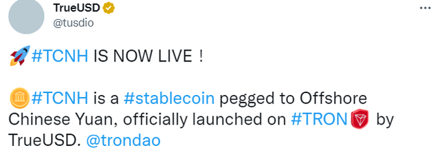달러 연동 스테이블코인 TUSD 발행사 트루USD가 15일(현지시간) 공식 트위터를 통해 트론(TRX) 기반 역외 위안화 스테이블코인 TCNH를 출시했다고 발표했다.