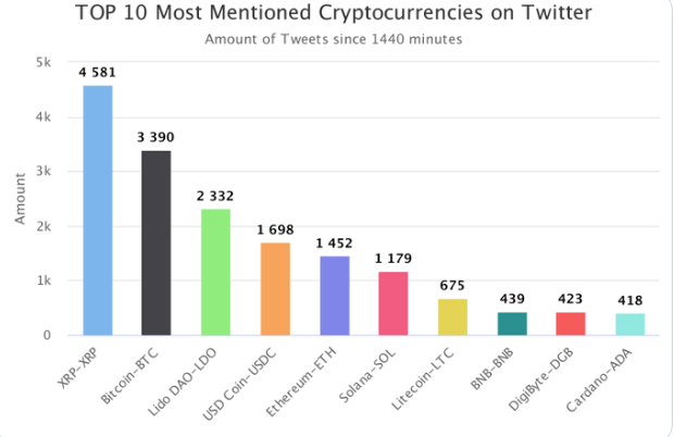 4위~10위에는 USD 코인(USDC, 1698회), 이더리움(ETH, 1452회), 솔라나(SOL, 1179회), 라이트코인(LTC, 675회), 바이낸스코인(BNB, 439회), 디지바이트(DGB, 423회), 카르다노(ADA, 418회) 등이 이름을 올렸다.