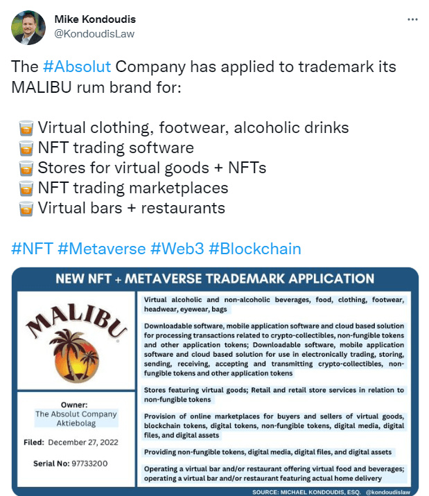 미국 변리사 마이크 콘두디스(Mike Kondoudis)가 3일(현지시간) 공식 트위터를 통해 스웨덴 보드카 제조사 앱솔루트 컴퍼니(Absolut)가 미국 특허청(USPTO)에 대체불가능토큰(NFT), 가상 아이템 관련 상표를 출원했다고 발표했다.