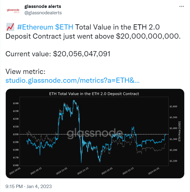 4일(현지시간) 가상자산(암호화폐) 데이터 분석 업체 글래스노드에 따르면 이더리움(ETH) 2.0(PoS 기반 이더리움) 입금 컨트랙트 주소 내 ETH 예치 규모가 200억달러를 돌파했다. 현재 가치는 총 200억5600만달러 규모다.