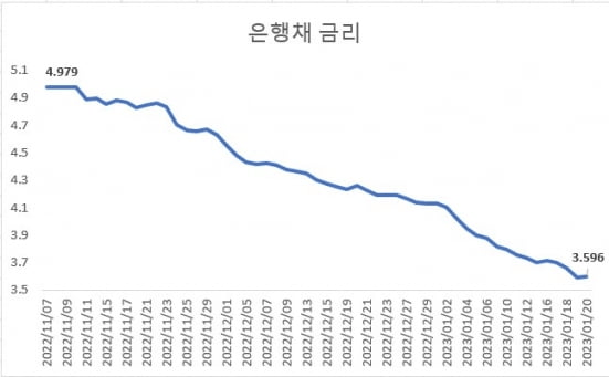 기준금리 인상에도 불구하고 시장 금리가 떨어지면서 은행들은 예금 금리를 연일 낮추고 있다. 금융투자협회 채권정보센터에 따르면 1년 만기 은행채(AAA) 금리는 작년 11월 7일 연 4.979%에서 지난 20일 연 3.596%까지 떨어졌다. 미국 인플레이션이 마침내 끝이 보이고 중앙은행 기준금리 인상 사이클도 막바지에 다다랐다는 기대가 시장에서 확산되고 있기 때문이다.