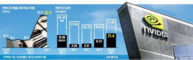1일 정보기술(IT)업계에 따르면 엔비디아는 2023회계연도 4분기(2022년 11월~2023년 1월) R&D에 19억5200만달러(약 2조5700억원)를 투자했다. 분기 매출(60억5100만달러)의 32.2%에 달하는 큰돈이다. 직전 분기에도 매출의 32.8%에 달하는 자금을 기술 개발에 썼다. 삼성전자(10.3%·2023년 1분기), 퀄컴(23.8%·2023회계연도 1분기) 같은 경쟁사들을 압도하는 수치다.
