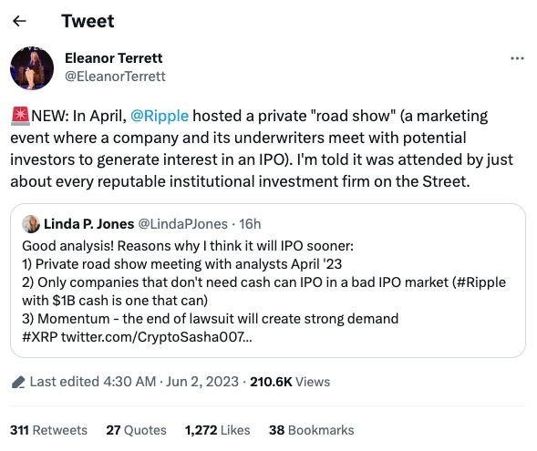 2일 엘레노어 테렛 폭스 비즈니스 소속 기자는 자신의 트위터를 통해 "지난 4월 리플이 비공개 로드쇼를 개최했고 행사에 거의 모든 유명 기관 투자사들이 참석했다"라고 밝혔다. 로드쇼란 IPO 전 잠재적 투자자들을 상대로 진행하는 설명회다.