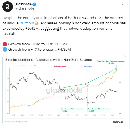 6일(현지시간) 가상자산(암호화폐) 데이터 분석 업체 글래스노드는 "지난해 루나(LUNA), FTX 사태 이후 0비트코인(BTC) 초과 보유 주소는 오히려 542만개 증가했다"고 전했다.