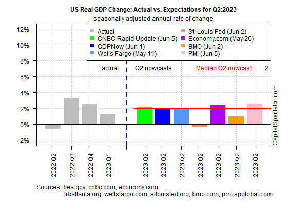 CapitalSpectator.com에서 집계한 현재 GDP 전망에 따르면, 미국이 2분기에 경기침체에 빠질 가능성은 여전히 낮다. 경기침체 예측이 지속되고 있지만, 수치상으로는 미국 경제가 단기적으로 여전히 확장될 것으로 보인다.