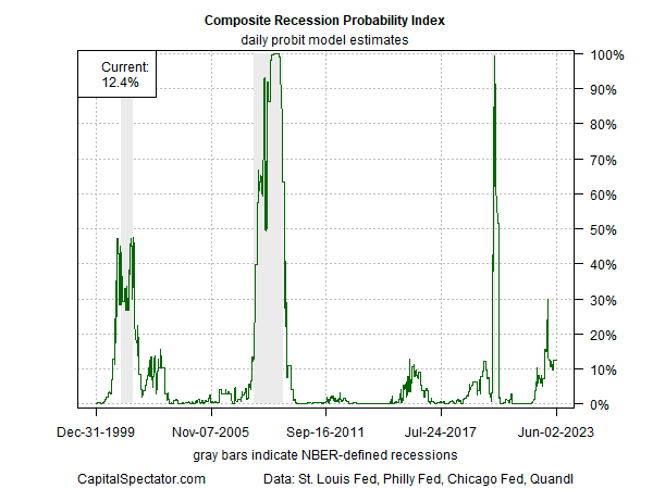 미국 비즈니스 사이클 리스크 보고서(BCRR)는 구독자들에게 올해 대부분 기간 동안 2022년 말의 부진한 경제지표가 반등하고 있다고 조언했으며, 최근 분석에서도 지난 몇 달 동안 비슷한 견해가 이어지고 있다. 뉴스레터의 주요 실시간 경기침체 지표인 다양한 비즈니스 사이클 지수를 집계한 결과, 현재 미국 경제가 침체에 빠질 확률은 12%에 불과한 것으로 추정된다.