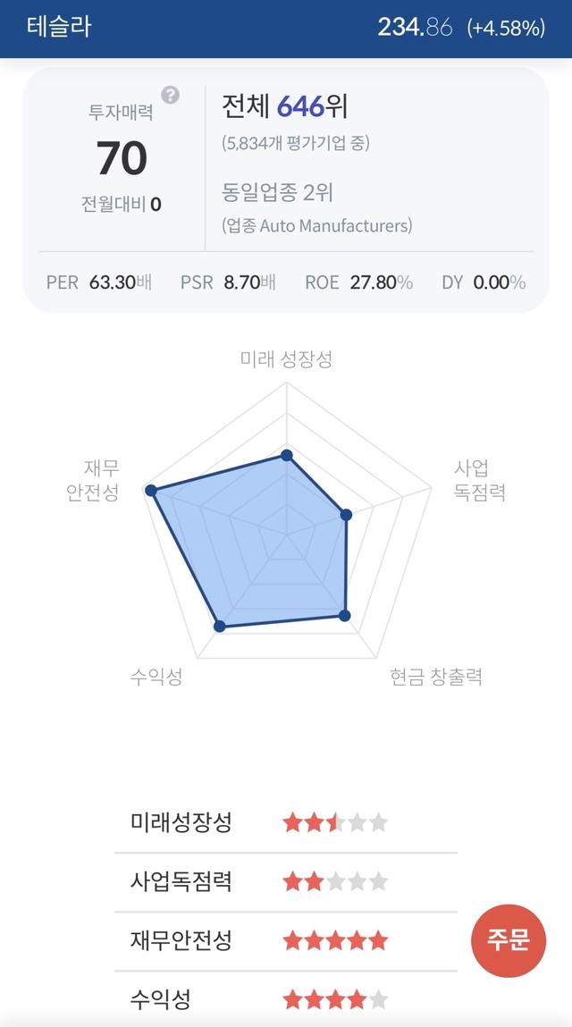 한편 한국경제TV 미국주식창에 따르면 테슬라의 투자매력 평가 순위는 전체 5,834개의 기업 중 646위로 평가됐다. 동일 업종 가운데선 2위를 차지했다.