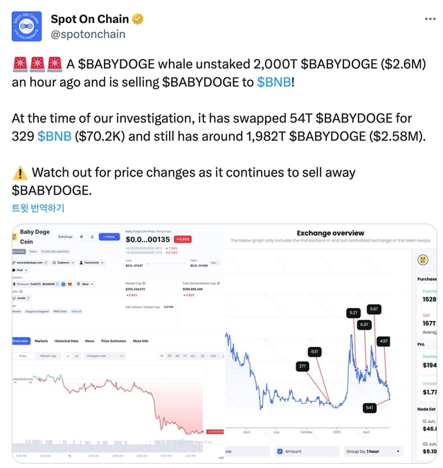 스팟온체인은 "현재 고래는 BABYDOGE 54조개를 스왑해서 BNB로 바꿨다"며 "고래는 아직 BABYDOGE를 1982조개 보유하고 있다. 매도가 지속될 경우 투자자는 가격 변동성에 주의해야할 것"이라고 덧붙였다.