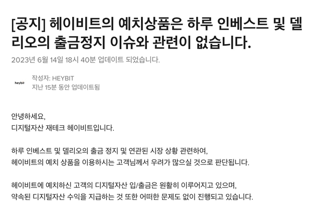 국내 가상자산(암호화폐) 투자사 헤이비트는 14일 공지사항을 통해 "헤이비트의 예치상품은 하루 인베스트 및 델리오의 출금정지 이슈와 관련이 없다"라고 밝혔다.