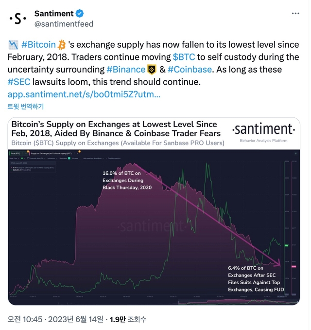 14일 가상자산 분석업체 샌티멘트는 공식 트위터를 통해 "주요 거래소에서 비트코인의 공급량은 2018년 2월 이후 최저치를 기록했다"면서 "바이낸스와 코인베이스를 둘러싼 불확실성 가운데 투자자들은 보유한 비트코인을 개인 지갑으로 옮기고 있다"라고 분석했다.