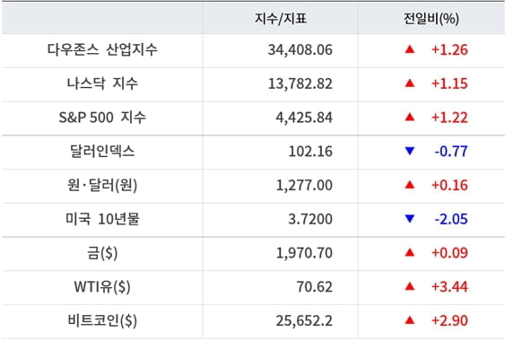 기술주가 상승했다. 애플 1.12%, 마이크로소프트 3.19% 오르며 사상 최고치를 경신했다. 메타도 3.1% 급등, 알파벳 1.15%, 넷플릭스 1%, 아마존 0.55% 상승 마감했다.