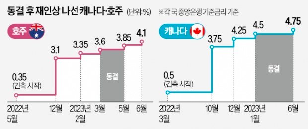 캐나다와 호주 중앙은행이 이달 잇따라 금리를 인상했다. 한국은행이 지난달 말까지 3차례 연속 기준금리를 동결한 것과는 다른 선택이다. 국가별 통화정책에 차이가 나타나면서 "올해 중앙은행의 역량이 시험대에 올랐다(이창용 한국은행 총재)"는 말까지 나온다.