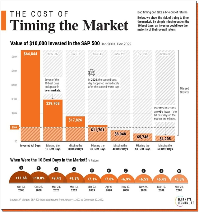 "만약 투자자가 단순히 시장에서 최고의 열흘을 놓친다면 최종 포트폴리오 가치의 50% 이상을 잃게 된다. 투자자는 단 29,708달러의 포트폴리오를 보유하게 되지만, 가만히 있었다면 64,844달러의 포트폴리오를 보유하게 되었을 것이다."