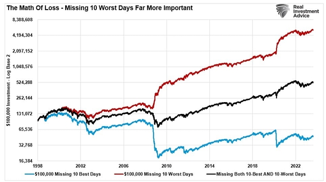 그렇다면 증시 최고의 날이 시장 최악의 기간에 발생한다면 그 기간을 피하는 데 집중하는 것이 더 논리적이지 않을까? 시장에서 "최고의 날"을 놓치면 시간이 지남에 따라 포트폴리오 성과가 저하되겠지만, "최악의 날"을 놓치면 어떻게 될까?