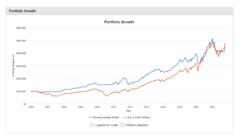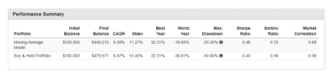 다음은 이동평균 모델과 매수 후 보유 포트폴리오를 비교한 결과를 나타낸다. "최대 드로다운"(MDD) 열을 주목하자.