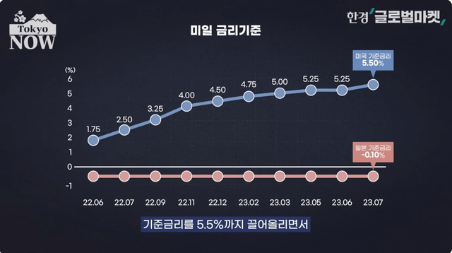 미국과 일본의 금리 차이가 확대되고 엔화 가치가 급락하면서 일본은 자국의 부가 해외로 빠져나가는 부의 유출을 겪었다. 2022년 1월까지 미국의 기준금리는 0.25%었다. 일본과 차이는 0.35%포인트였다. 작년 3월부터 미국 중앙은행(Fed)이 인플레를 잡기 위해 기준금리를 5.5%까지 끌어올리면서 미일 금리차는 순식간에 5.6%포인트까지 벌어졌다.