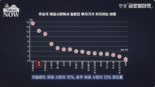 해외 투자가 늘어나면서 일본인 투자가들은 주요국 채권시장의 큰 손이 됐다. 아일랜드 채권시장의 15%, 호주 채권시장의 12%를 일본인 투자가들이 차지하고 있다. 미국과 영국 채권시장 점유율도 5%에 달한다.