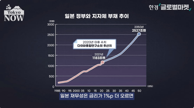 일본은행과 일본 정부가 가장 피하고 싶은 시나리오는 금리가 급등하는 것이다. 일본은 현재 1026조엔의 부채를 짊어지고 있다. 일본 재무성은 금리가 1%포인트 더 오르면 2025년부터 연간 이자부담이 3조7000억엔 늘어날 것으로 예상한다. 금리가 예상보다 2%포인트 더 오르면 이자부담은 7조5000억엔 더 증가한다.