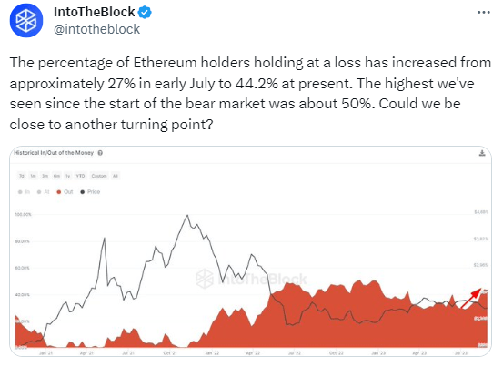 가상자산(암호화폐) 마켓 데이터 분석 플랫폼 인투더블록(IntoTheBlock)이 4일(현지시간) 공식 X(구 트위터)를 통해 "온체인 데이터 기준 손실 상태(취득가가 시세보다 높은 경우)의 이더리움(ETH) 보유자 비중이 7월 초 약 27%에서 현재 44.2%로 약 17.2%p 늘어났다"고 분석했다.