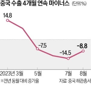 일각에선 중국 경기가 서서히 반등 조짐을 보인다는 분석도 내놨다. 수출 감소세가 두 달 만에 한 자릿수로 누그러졌고, 중국의 8월 공식 제조업 구매관리자지수(PMI)도 6∼7월보다 소폭 상승하는 등 지표가 개선되고 있어서다.