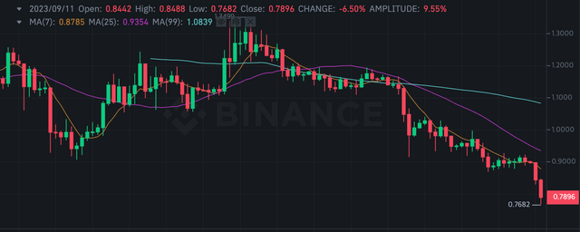 11일 글로벌 가상자산(암호화폐) 바이낸스 테더(USDT) 마켓 기준 아비트럼은 전일 대비 8.16% 하락한 0.79달러에 거래되고 있다. 상장 직후 한때 기록했던 최고점(1.82달러)와 비교해 약 57% 떨어진 것이다.