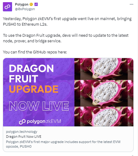 폴리곤(MATIC)이 21일(현지시간) 공식 X(구 트위터)를 통해 "폴리곤(MATIC) zkEVM 메인넷 베타의 '드래곤프룻'(Dragonfruit) 업그레이드를 완료했다"고 발표했다.