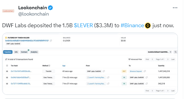 28일(현지시간) 블록체인 온체인 데이터 분석 업체 룩온체인(Lookonchain)이 공식 X(구 트위터)를 통해 DWF 랩스 소유 월렛이 약 10분전 바이낸스로 330만달러 규모의 LEVER을 이체한 것으로 나타났다.