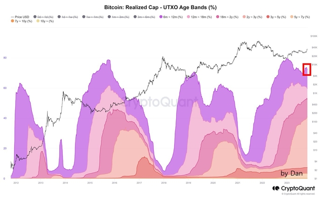 1일(현지시간) 가상자산(암호화폐) 온체인 분석 플랫폼 크립토퀀트(CryptoQuant)의 댄 분석가는 자신의 X(트위터)를 통해 "중요한 지표 중 하나인 6개월 이상 홀딩 비트코인 비율이 감소세를 나타내고 있다. 아직까지 소폭 감소했을 뿐이지만, 이는 신규 또는 기존 자금 유입의 근거로 볼 수 있으며, 이 비율이 계속 감소하며 상승이 나올 경우 상승장이 더욱 더 확고해진다"라고 설명했다.