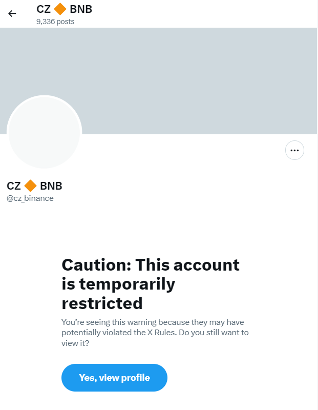 현재 창펑자오 바이낸스 전 CEO의 X 계정(@cz_binance)에 접근하면 "해당 계정은 일시적으로 접근이 제한됐다. 운영규칙을 위반했을 가능성이 있다"는 내용의 문구를 확인할 수 있다.