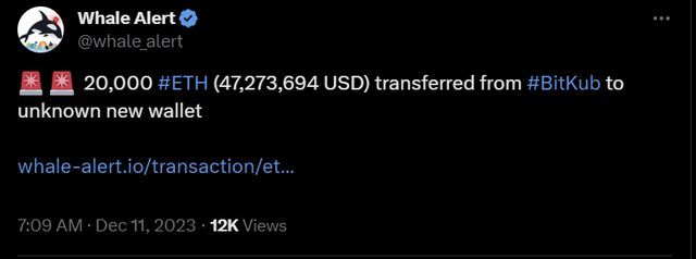 특정 고래(거액 투자자)가 20000개의 이더리움(ETH)을 태국 가상자산 거래소 비트커브(Bitkub)에서 익명의 지갑으로 이동시킨 것으로 확인됐다.