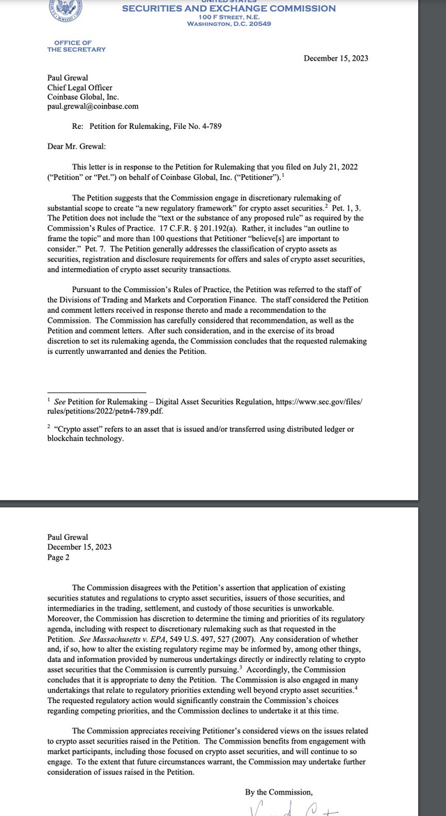 반면 SEC는 코인베이스가 제시한 청원서에 대해 "제안된 규칙과 내용이 부족"하다며 거부 이유를 설명했다. 또한 기존 규제가 실효성이 없다는 청원의 주장에 동의하지 않는다고 밝혔다.