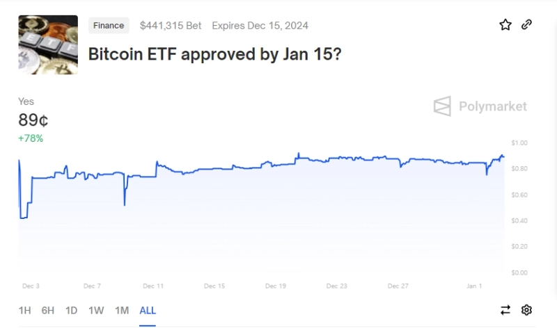 2일(현지시간) 코인데스크 보도에 따르면 분산형 예측 플랫폼 폴리마켓(Polymarket) 트레이더들 중 89%가 1월 15일 이전에 비트코인 현물 ETF가 승인 될 것이라고 예상하고 있다.