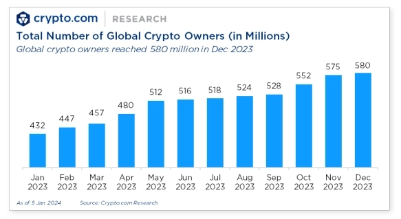 22일(현지시간) 가상자산 전문 미디어 코인텔레그래프는 크립토닷컴 시장 규모 보고서를 인용해 "2023년 말 기준 전 세계 가상자산 사용자, 소유자의 수가 5억명을 넘어섰다"라고 보도했다.