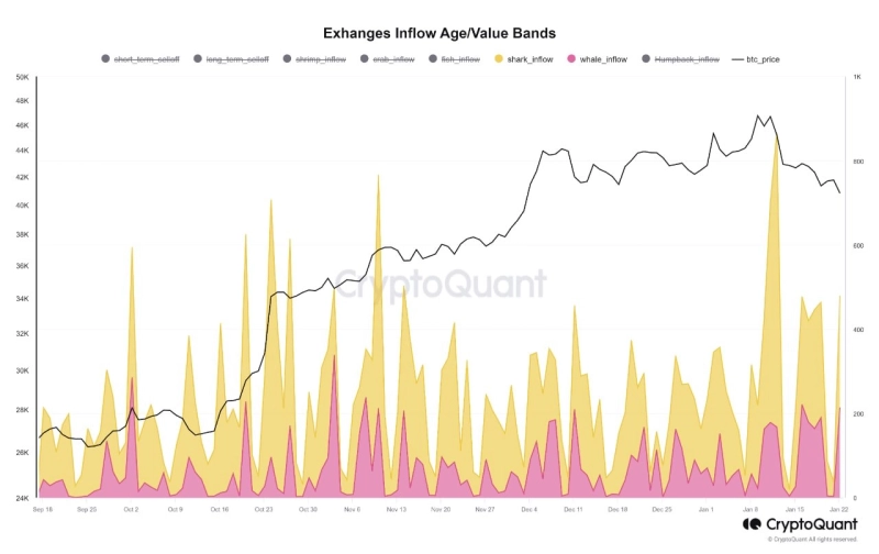24일(현지시간) 가상자산(암호화폐) 온체인 분석 플랫폼 크립토퀀트(CryptoQunat)는 공식 X(트위터)를 통해 "최근 중앙화 거래소로 유입되는 비트코인을 가치 밴드에 따라 분류한 결과 이번 하락의 원인이 상어, 고래 투자자들의 매도압력인 것으로 드러났다"라고 밝혔다.