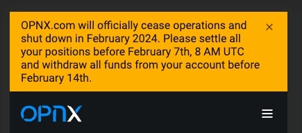 1일(현지시간) OPNX는 공식 홈페이지를 통해 "2월 내로 운영을 중단하고 폐쇄한다. 오는 7일 오후 5시(한국시간)까지 포지션을 정리하고 14일까지 모든 자산을 인출해주기를 바란다"고 말했다.