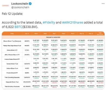 12일(현지시간) 룩온체인에 따르면 이날 미국에서 거래되고 있는 9개 비트코인(BTC) 현물 상장지수펀드(ETF)의 BTC 보유량이 약 6822BTC 순증가한 것으로 나타났다.