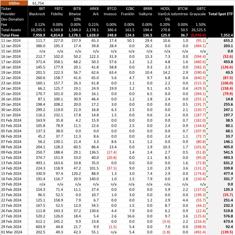 1일(현지시간) 비트코인(BTC) 현물 ETF 상품의 순유출액 합이 일주일만에 순유입액을 능가했다.